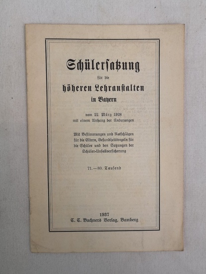 Schülersatzung für die höheren Lehranstalten in Bayern vom 22.März 1928 mit einem Anhang der Änderunge. 71.-80. Tsd. Bamberg : Buchners Verlag, 1937. 18 S. geh.; Frakturschrift. Heft in gutem Zustand, Seiten sauber und hell, mit einigen Unterstreichungen und Randbemerkungen 0.