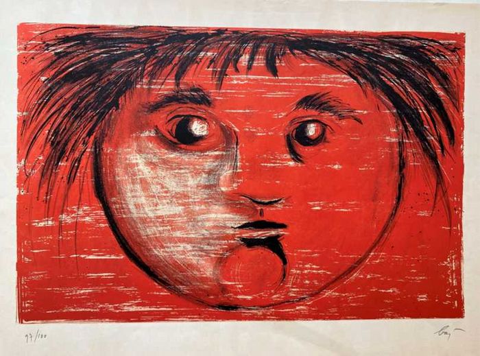 Original Farblihographie. Blattgröße ca. 42 x 57 cm. _. Eins von 100 Exemplaren. Signiert. - Enrico Baj war italienischer Maler, Bildhauer, Kunsthistoriker und Anarchist.Baj gestaltet die Avantgarde der fünfziger Jahre entscheidend mit. Enrico Baj gründet 1951 die künstlerische Bewegung der "Movimento Nucleare". Der Künstler ruft zusammen mit Asger Jorn 1953 die "Le Mouvement international pour une Bauhaus Imaginiste" aus. Intensiven Austausch mit anderen Vorreitern der Kunstgeschichte wie Max Ernst, Marcel Duchamp und Yves Klein, unterhält Baj zusammen mit anderen Künstler der Gruppe COBRA. Enrico Baj erschafft mit Gemälden, Zeichnungen, Collagen, Objekten und Skulpturen eine eigene groteske Figurenwelt, die sich gegen bürgerliche Konventionen, gesellschaftliche und politische Mißstände wendet. Der Künstler illustriert mehrere Bücher. Darüberhinaus arbeitet Baj an verschiedenen Künstlerbüchern mit und ist selbst schriftstellerisch tätig. Ab 1964, nach seiner Teilnahme an der Biennale in Venedig, widmen sich zahlreiche europäische Museen dem Werk Enrico Bajs. Enrico Baj stirbt am 16. Juni 2003 in Vergiate. - ImAußenrand nachgedunkelt, etwas bestoßen, schwache Knickspuren O-ub.