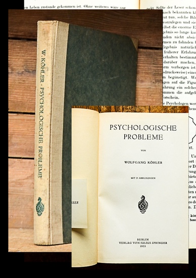 Psychologische Probleme. Berlin, Springer, 1933. circa 25 x 17,5 cm., VII, 252 SS., mit 20 Figuren im Text. Original-Halbleinen Erste deutsche Ausgabe, revidiert und gegenüber der englischen Fassung von 1929 (unter dem Titel: Gestalt Psychology) überarbeitet. Wolfgang Köhler (1887-1967) gilt neben Max Wertheimer, dem dieses Werk gewidmet ist, als einer der Begründer der Gestaltpsychologie. - Aussen etwas berieben und angestaubt, innen sauber. - Beiliegend eine Karte "Überreicht vom Verfasser".