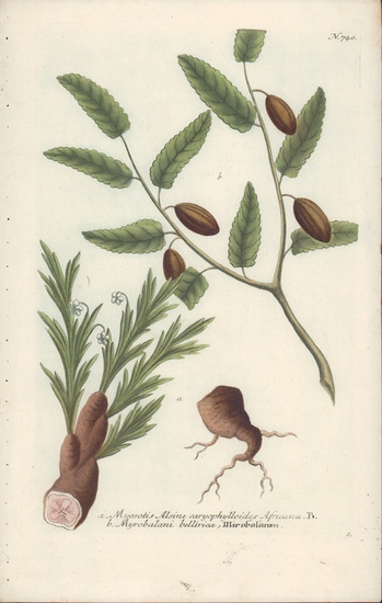 a. Myosotis Alsine caryophylloides Africana. b. Myrobalani belliricae, Mirobalanen. - Regensburg:, [um 1740]. Altkolorierter Farb-Kupferstich, 31 x 20,5 cm (hoch), Blattgröße 39 x 25 cm. Farbstich, altkoloriert. Dargestellt sind Pflanzen der Gattung Myosotis und Myrobalani, unter dem Bild namentlich aufgeführt. In der Platte unten rechts der Buchstabe S. wohl Matthäus Seutter. - Aus: J.W. Weinmann, Phytanthoza iconographia, erschienen in Regensburg 1737 - 1745. Die Stiche von Seutter, Ridinger und Haid. - Johann Wilhelm Weinmann 1683 -1741, deutscher Apotheker und Botaniker. - Am unteren Rand minimal fleckig. Ein schönes Blatt.