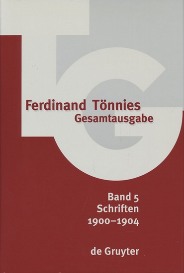 Politik und Moral. Gesamtausgabe. Band 5: 1900-1904. Politik und Moral. Vereins- und Versammlungsrecht wider die Koalitions-Freiheit. L'Évolution sociale en Allemagne (1890-1900). Die Ostseehäfen Flensburg, Kiel, Lübeck. Schriften. Rezension. Herausgegeben von Bärbel Carstens und Uwe Carstens. Berlin und Boston, Walter de Gruyter, 2018. Groß-8°. 24 x 16 cm. XVI, 638 Seiten. Original-Leinenband mit Original-Schutzumschlag. (= Ferdinand Tönnies: Gesamtausgabe TG. Herausgegeben von Lars Clausen, Alexander Deichsel, Cornelius Bickel u.a., Band 1. Auflage. Neuwertiges Exemplar.