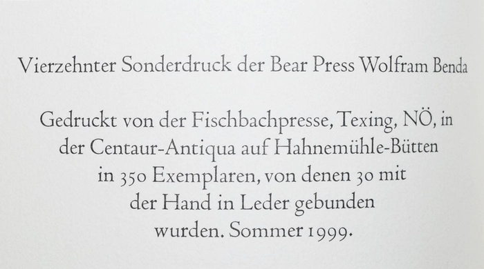Weltgeheimnis. Gedichte. Bayreuth, Bear Press Wolfram Benda, 1999. 4°. 30 S., [1] Bl. Orig.-Pappband mit goldgepr. Rücken- und Deckeltitel und Klarsichtschutzumschlag. (Sonderdruck der Bear Press Wolfram Benda, Band 14). Eines von 350 Exemplaren. - Tadellos.