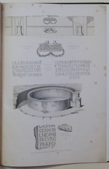 Die römische Villa zu Nennig. Ihre Inschriften. Hrsg. von der Gesellschaft für nützliche Forschungen zu Trier. Lintz, Trier, 1868. Folio, 18 S. Text + 2 lithographierte Tafeln (etwas stockfleckig), Original-Broschureinband (beschädigt und angestaubt) in modernem Halbleinwandeinband mit Deckelschild.