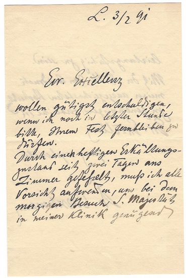 Eigenh. Briefkarte mit U. [Leipzig], 31. Juli 1908. 2 SS. Qu.-kl.-8vo. An Herrn Herzog, dem er mitteilt, daß er wegen einer Darmgrippe nicht ausgehen und deshalb das Fest nicht besuchen könne. Er läßt grüßen und wünscht einen schönen Verlauf der Feier. - Curschmann ließ das Eppendorfer Allgemeine Krankenhaus erbauen. Von 1888 bis zu seiner Emeritierung war er Ordinarius für Innere Medizin an der Univ. Leipzig. Er zählt zu den führenden Klinikern seiner Generation.