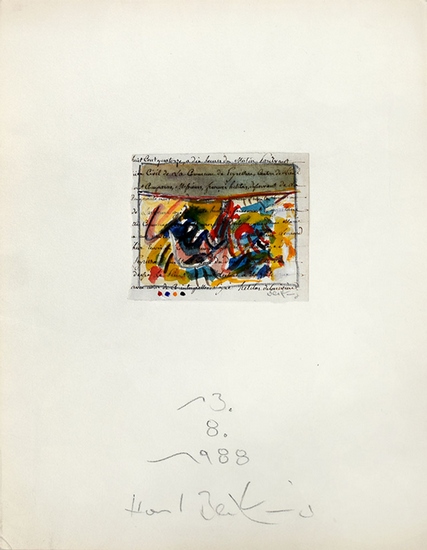 Abstrakte Komposition. Übermalung. 13.8.1988. [Original-Aquarell auf alter Handschrift, signiert / original watercolor on old manuscript, signed]. _. Horst Becking, geboren am 14. Januar 1937 in Hagen. Deutscher Maler, seit 1964 Mitglied des Westdeutschen Künstlerbundes Original-Aquarell auf alter Handschrift, diese auf Büttenkarton fixiert. Von Horst Becking unterhalb der Abbildung signiert und datiert. Rückseitig Original-Radierung "Im schönen Sauerland", unterhalb der Abbildung von Horst Becking, datiert, signiert und mit Widmung an einen Sammler versehen. Maße Aquarell: 8,5 x 10,5 cm. Maße Blatt: 32,5 x 25,7 cm. Blatt wenig angestaubt, Randbereich minimal gedunkelt. Noch sehr guter Zustand. Original watercolor on old manuscript, fixed on laid paper. Signed and dated by Horst Becking below the image. Verso original etching "Im beautiful Sauerland", below the illustration by Horst Becking, dated, signed and dedicated to a collector. Dimensions watercolor: 8.5 x 10.5 cm. Sheet dimensions: 32.5 x 25.7 cm. Sheet slightly dusty, marginal area slightly darkened. Still very good condition.
