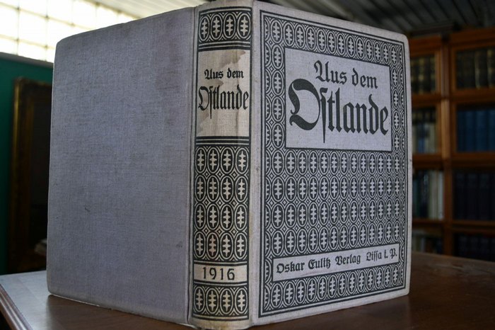 Aus dem Ostlande. Posener Land und Weichselgau. Monatsblätter für Heimatkunde, Dichtung, Kunst und Wissenschaft des deutschen Ostens. 11. Jahrgang, 1916. Lissa i.P., Eulitz, 1916. 464 S. mit Abb. 27 x 20 cm, Leinen ohne Schutzumschlag. Einband berieben, bestoßen und angeschmutzt. Falz zwischen Frontinspiz und Titel geöffnet. Titelblatt mit Tesafilmklebungen und Einrissen. Immer wieder fleckig. S. 14 mit Tesafilmklebung. Papierbedingt gebräunt.