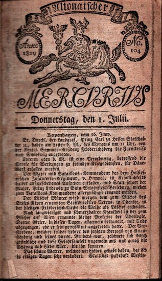 Altonaischer Mercurius. 2 Bde. Altona, 1819. Kl.-8vo. Bibl.-HLn. Nos. 104-124 (1. Juli - 5. August) u. 128-156 (12. August - 30. September) / 157-170 (1.-25. Oktober) u. 172-209 (28. Oktober - 31. Dezember). - Vgl. Bertheau, S. 33; Diesch 1581; Traub 2019- Miteingebunden: Königl. privil. Altonaer Adreß-Comtoir-Nachrichten Nr. 82 vom 13. Oktober 1819 (2 gefalt. Bll.). - Der "Altonaische Mercurius", eine der ältesten Altonaer Zeitungen, erschien viermal in der Woche, die einzelnen Nrn. zu je 8 Bll. Sie enthielten neben Nachrichten aus Europa fast ausschließlich dort veröffentlichte amtliche Bekanntmachungen (wie Konkurs- und Erbschaftsmitteilungen), private Anzeigen von Geburten u. Todesfällen, Geschäfts-Anzeigen, Lotteriegewinne, Wechselkurse, Stellengesuche u. -angebote etc. - Buchblöcke etw. verzogen, Papier gebräunt, erste Juli-Ausgabe knapp beschnitten, mit Buchstabenverlust, 1 Bl. mit Einriß.