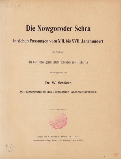 Die Nowgoroder Schra in sieben Fassungen vom XIII. bis XVII. Jahrhundert. Im Auftrage der baltischen geschichtsforschenden Gesellschaften hrsg. Mit Unterstützung des Hansischen Geschichtsvereins. Lübeck, Kommissionsverlag Lübcke & Nöhring / Druck von C. Mattiesen, Dorpat 1911,1914, 1916. X S., 1 Bl., 216 S., 1 s/w Taf., Register sowie Nachträge u. Verbesserungen (145 S.). 4to (29,5 x 23,5 cm). Bibl.-HLn. mit hs. RSch. Die Nowgoroder Schra war die Hofordnung des Peterhofs, des deutschen Kontors der Hanse in Nowgorod. Sie ist die einzige vollständig in Schriftform überlieferte Hofordnung eines der vier Hansekontore (Brügge, Bergen, Nowgorod u. London) u. verbindet stadtrechtliches Regelwerk mit dem eigenen der hanseatischen Kaufmannsgenossenschaften. - Wolfgang Schlüter (1848-1919), Privat-Dozent für Altgermanistik u. Vergleichende Sprachwissenschaft, Bibliothekar an der Universitäts-Bibliothek Dorpat (Balt. Biogr. Lex. digital). - Bibl.-Sign. a. unt. Kap. sowie Sign. u. gelöschten Stempeln aVuT.