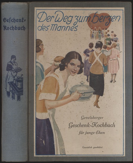 Der Weg zum Herzen des Mannes. Gevelsberger Geschenk-Kochbuch für junge Ehen. Stuttgart, Stuttgarter Vereins-Buchdruckerei, [ca. 1920]. 8°. 20 x 14 cm. 326 Seiten, 13 Blatt. Illustrierter Original-Leinenband mit rotem Farbschnitt. 1. Auflage. Einband leicht berieben, Hinterdeckel und Rücken wenig fleckig, Deckelillustration stockfleckig. Innenfalz 2 cm eingerissen, Blätter papierbedingt gebräunt, einige Blätter braunfleckig. Gutes bis sehr gutes Exemplar.