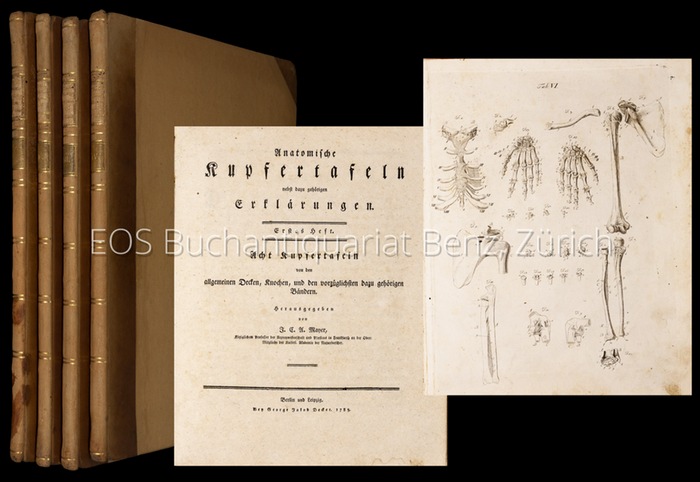 Anatomische Kupfertafeln. nebst den dazu gehörigen Erklärungen. Berlin, Georg Jakob Decker, 1783?1788. 4°. 58 S.; (4), 44 S.; (4), 52 S. Mit 26 Kupfertafeln. Halblederbände der Zeit. + Wichtig: Für unsere Kunden in der EU erfolgt der Versand alle 14 Tage verzollt ab Deutschland / Postbank-Konto in Deutschland vorhanden +, A 3 (von 6) Bände. Es erschienen total 6 Hefte. Vorhanden sind: Erstes Heft: Allgemeine Decken, Knochen, und den vorzüglichsten dazu gehörigen Bändern.- Zweite Heft: Muskeln und Muskelbändern. - Drittes Heft: Eingeweiden und den dazu gehörigen Muskeln und Bändern. Papier durchgehend stärker stockfleckig. Die Einbände berieben und bestossen.