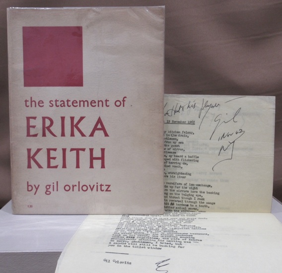 The statement of Erika Keith. and other strories, poems and a play. Berkeley, The Miscellaneous Man 1957. 1957. gr.-8°, 63 S. OKart. Erste Ausgabe.- (= The Miscellaneous Man 11-12).- Beiliegen zwei maschinenschriftliche Typoskripte von Gedichte auf gelblichen Durchschlagpapier jeweils von Gil Orlovitz signiert und mit einer Widmung versehen (datiert 1. Nov. 62 und 28. March 64).- Name auf Innendeckel, Rücken gering fleckig.