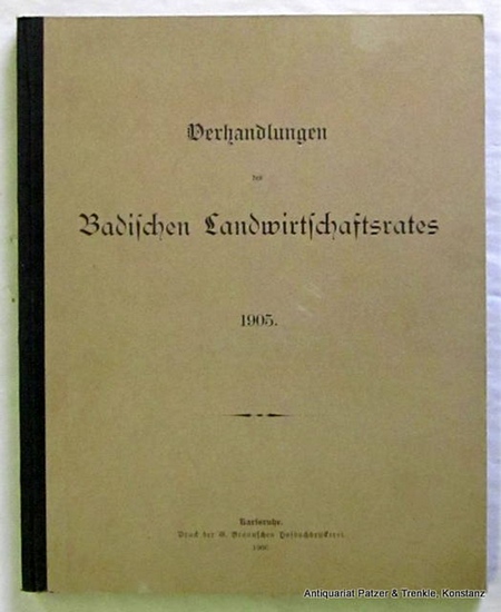 Karlsruhe, Braun, 1906 _. 4to. (26.5 : 21,5 cm). Mitglieder, Protokoll, Beilagen, Denkschriften etc. alle mit separater Seitenzählung (zus. ca. 218 S.). Orig.-Halbleinenband. Behandelt wurden neun Themen, darunter Förderung der Pferde- und Geflügelzucht, Einführung einer Landesbauordnung, Neuordnung der Hagelversicherung, Gründung einer Landwirtschaftskammer etc. Interessant ist eine Untersuchung der Fleischpreise, die durch eine starke Teuerung (bis zu 20%) im Sommer 1905 angestellt wurde. - Sehr gutes Exemplar.