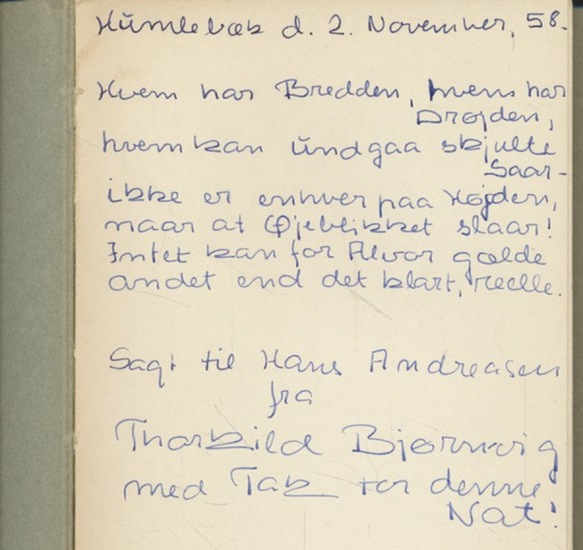 Anubis - Digte af Thorkild Bjørnvig. [Widmungsexemplar]. Gyldendal., 1956. 82 S. kart. / Paperback. Verfasserwidmung auf Vorsatz / Forfatterens dedikation til hensigten - Leicht lichtverändert, innen sehr sauber / Lidt lyse pletter, indvendig meget ren - ANUBIS -- Kim -- Samtale -- Cypresser under natlig Himmel -- Variationer over Foraaret -- Moderne Tema -- Jalousi -- Cæsarmaske -- Mona Lisa -- Sten -- Lille Højsang -- Klassisk Tema -- Barndommens Hus -- Uglen -- Hjemkomst -- Sejdmændene paa Skratteskær -- Cikader -- Fragment -- Tilsidst -- Jørgen Nielsen -- Søvnløs -- Den sorte Dag -- Sorg Anubis -- Noter -- ANUBIS -- Hvor du er ensom, fremmed og urørlig, siddende Stengud, stum og blank og sort; ufattelig for Hjærtet, umedgørlig, af Mennesker umenneskeliggjort, beviser saligt du: jeg er en Magt! -- Og hvilken ? Hvor symmetrisk og retfærdigt i dette ranke spændingsfyldte Hvil besvarer du mig, mens du strammer værdigt, sagligt fordybet og i spredt Foragt dit uudgrundelige Hundesmil. -- En Dødsgud, tydeligt! mit Hjærte prøves, det rejses fra sit Leje mer og mer, og paa min Holdning, paa mit Ansigt øves ordnende Virkning ; hvad der sker, det sker og gælder og dets Tid er afmaalt, sat. -- Og jeg, en sejg, kedsommelig, en ussel Hverdagsudødehg, jeg véd, jeg véd - og føler som en Køhng denne Trusel, et Støvregnssus fra Stenens stille Nat, befri mig fra min træge Evighed ( ... ) . Thorkild Strange Bjørnvig; 2 February 1918, Aarhus, Denmark ? 5 March 2004, Samsø ) was a Danish author and poet. - In 2006, the title poem from Bjørnvig's 1955 collection of poems Anubis became part of the Danish Culture Canon of literature. - aus Wiki.
