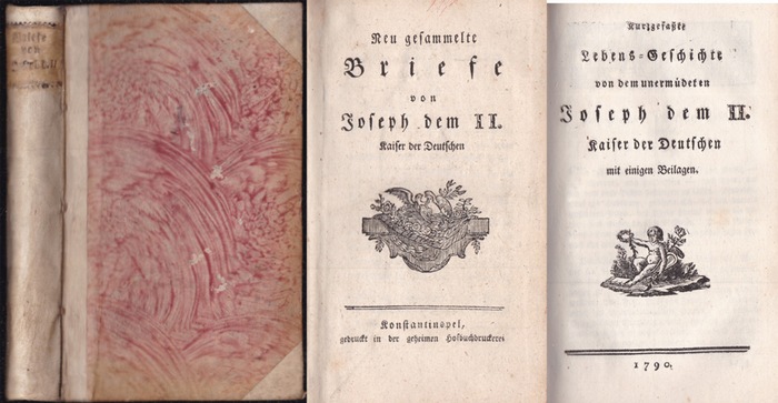 Neu gesammelte Briefe von Joseph II. Kaiser der Deutschen. Beigebunden: I. Kurzgefaßte Lebens-Geschichte von dem unermüdeten Joseph dem II. Kaiser der Deutschen von 1790, ohne Orts- u. Verlagsangebe / II. Hymne zur Thronbesteigung Leopolds im Monat März 1790 gesungen in den Gebürgen Oberkärnthens von einem evangelischen Geistlichen, gedruckt bei Karl Walliser in Klagenfurt. Konstantinopel, Geheime Hofbuchdruckerei, 1789. EA, kl 8!, Halbpergamenteinbd. d. Zeit, 156 S. (mit fehlerhafter Paginierung, auf S. 48 folgt bei fortlaufendem TRext S. 65), 86 ohne Paginierung (14 S.) - vorderer Einbanddeckel etwas berieben, Eintrag auf dem Inenndeckel, sonst wohlerhaltene Exemplare der äußerst raren Publikationen.