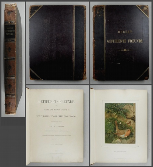 Gefiederte Freunde. Bilder zur Naturgeschichte angenehmer und nützlicher Vögel Mittel-Europas. Nach der Natur gezeichnet. Mit erläuterndem Text von O. von Riesenthal. Leipzig, Arnoldische Buchhandlung., (1880-1883). 40x30 cm. 2 Bl., 60 chromolithographierte montierte Tafeln. Originalhalblederband goldgeprägtem Rücken- und Deckeltitel. Nissen Ill. Vogelbücher 785. - Tafelband, ohne erläuterndem Text von O. von Riesenthal. "Sechzig chromolithographirte Tafeln in Klein-Folio. Lithographie von Thurwanger. Farbendruck von Lemercier & Cie. in Paris." - Leder stark beschabt. Rücken mit Einrissen. Vorderer Vorsatz etwas knittrig und angestaubt. Titelblatt fingerfleckig. Tafeln 43 und unten mit Randeinrisse, ausserhalb des Bildes.- Die grösstenteils Tafeln sauber.