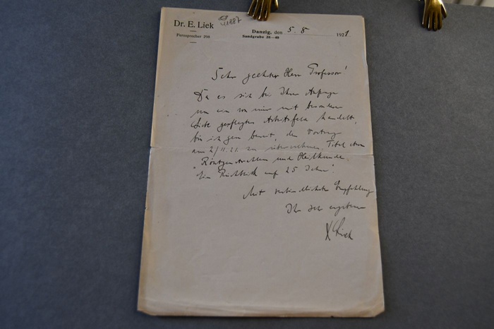 Handschriftlicher Brief des Arztes und Publizisten Erwin Liek (1878-1935) vom 5. August 1921 an den Danziger Lehrer und Botaniker Konrad Lakowitz (1859-1938). Danzig, 1921. 21 x 15 cm, Einzelblatt. 1-seitiger handschriftlicher Brief. Durchgehende Längs- und Querfalze, Einrisse. Aufgedruckter Briefkopf. Liek sagt zu am 2. November 1921 einen Vortrag zum Thema "Röntgenstrahlen und Heilkunde" zu halten.