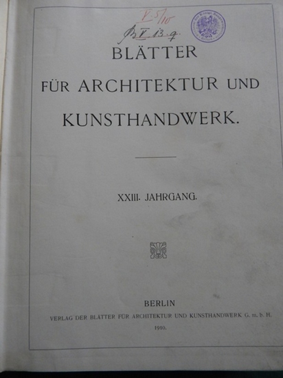 Beiblätter ! (Beiblatt für Architektur und Kunsthandwerk - Jahrgang XIII Nr. 1-12 und XXIII Nr. 1 bis 12 / 1910 Berlin, Verlag der Blätter für Architektur und Kunsthandwerk. Bibliothekseinband: Halbleder, mit marmorierten Deckeln, gr. DinA 4, Großformat, etwa 190 Beiblätter des XIII 1910 (Nr.1-12) vorab + 48 Seiten Blätter für Architektur und Kunsthandwerk (BEACHTE: XXIII. 1910 Nr. 1.-12.), einige sw-Photos und VIELE Werbeanzeigen, im Anhang 120 einseitig mit sw-Photos bedruckte Tafelseiten, danach noch 12 Nebentafeln, Bibliotheksexemplar: Einband mit deutlichen Gebrauchsspuren, sehr stark beschabt, berieben und bestoßen, alte fehlerhafte Klebeschilder über dem Rücken, Rücken oben stärker aufgeschabt, Schnitt leicht fleckig, Schnitt und Seiten papierbedingt unterschiedlich stark gebräunt, Vorsatzblatt stockfleckig, Titelblatt fleckig, bestempelt und beschrieben, innen gut, insgesamt ordentlicher Zustand. Jahrgang 1910; Beiblätter Jahrgang 13 und Blätter Jahrgang 23; wegen des hohen Gewichts Versand in Länder außerhalb der EU nur auf Anfrage und Portoerhöhung möglich / higher shipping-costs outside EU.