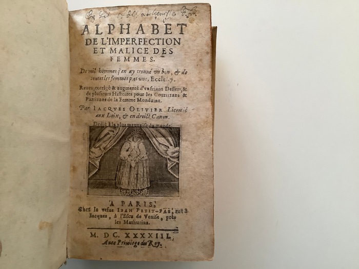 Alphabet de l'imperfection et malice des femmes. Paris, Jean Petit Pas, 1633. 15,5 : 9 cm. 435 pages with engraved title-vignette, 12 leaves index. Contemporary vellum. Later, still very rare edition, attributed the work to Jacques Olivier, "Licencié aux Lois en droit.? The text is a late squawk of the "Querelle des femmes.? ?Part accusation and part apology, the arguments use rhetoric that one assumed was long buried? (Albistur & Armogathe). The passion of the author was nonetheless as captivating to a certain public as were the many lies already circulating about Marguerite of Valois, Queen of Navarre, a woman of letters and generous cultural patron, who had the means and courage to lead an independent life, sexual and otherwise, after her separation from Henri IV in 1585, and who remains one of the most slandered women of European history. Thus, like the tales of her debauchery, this work gained wide circulation. Gay?s list of 17 later editions, from 1619 to 1666, is incomplete, as the book was reprinted within weeks of this first edition (another known 1617 edition is marked "4th edition.?) It inspired a spate of rebuttals and counter-defenses. An English translation appeared in 1662; and the titles of the chapters were borrowed for an unrelated German series of "student?s pseudo-philosophical talk, enigmas,? etc., published in 1667 (cf. J. Hilton, Chronograms Continued, 1885, 160-161). OCLC locates only a handful of copies of this edition, including one copy in the US (Library of Congress, incomplete). Gay-Lemonnyer I: 69-70; Brunet IV: 182. Cf. Albistur & Armogathe, Histoire du Féminisme français (1977), 160-161. Item #4135 edition of a best-selling misogynistic rant, alphabetically ordered. Directed in principle, according to Paul Lacroix, against Marguerite de Valois (who died in 1615), identified in the vituperative dedication as "la plus mauvaise du monde,? the condemnation of the Queen?s vanity and viciousness is extended to the entire female sex. From Avidissimum animal / Tres-avide animal and Bestiale baratrum / Abysme de bestise to Yvrognesse éhontée (the letter Y permitting no Latin term) and Zelus zelotipus / Zèle jaloux, each of the 23 chapters explores a human vice, psychic failing, or personality defect, rather arbitrarily applying it to women in particular. Citing the Bible, classical texts, and a few contemporary poets, the author envelopes his non-arguments in a rich French vocabulary of often alliterative insults, objects, animals and plants. Following the letter Z are several short pieces: a letter to the censor, a long poem titled "Ressentiment de la malice des femmes,? and, as promised in the preface to the reader as proof of the author?s open-mindedness, a dozen pages of advice to "virtuous women.? The edition concludes with a colorful subject index. - Mirroring the libellous nature of the text, the title vignette shows a woman [Marguerite] with snakes as hair and chicken?s feet, holding a headless chicken and suckling a pair of kittens (so identified in the dedication) from two pendulous breasts.
