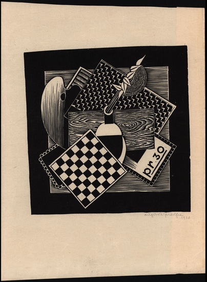 Stilleben mit Schachbrett und Malerpalette. 1930. [Signierter Original-Linolschnitt / signed original linocut]. _. (August Preuße, geboren am 22. März 1908 in Höhscheid, gestorben am 9. März 1942 in Russland. Nach einer Ausbildung an d Original-Linolschnitt auf dünnem Papier, unterhalb der Abbildung von August Preuße in Blei signiert und datiert (1930). Maße Blatt: 40,5 x 33,5 cm. Maße Abbildung: 24,4 x 24,4 cm. Provenienz: Aus dem Nachlass des Kunstsammlers und Autors Ralf Seilheimer. Randbereich leicht knitterig. Guter bis sehr guter Zustand. Original linocut on thin paper, signed and dated (1930) in lead by August Preuße below the image. Sheet dimensions: 40.5 x 33.5 cm. Dimensions illustration: 24.4 x 24.4 cm. Provenance: From the estate of the art collector and author Ralf Seilheimer. Edge area slightly creased. Good to very good condition.