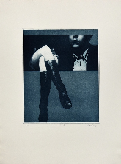 Beine. (2. Zustand). [19]70. [Signierte Original-Farbradierung / signed original color etching]. _. (Klaus Böttger geboren 1942 in Dresden, gestorben 1992 in Wiesbaden. Deutscher Graphiker. Seit 1964 arbeitete er im Bereich der Druckgraphik, vor allem Radierungen. Seine Motive standen unter dem Einfluss von Pop Art und Phantastischem Realismus). Nummer 69 von 100 nummerierten Original-Farbradierungen auf Büttenpapier. Von Klaus Böttger unterhalb der Abbildung in Blei nummeriert, beschriftet, signiert und datiert (70). Technik: Ätzung, Aquatinta, Mezzotinto auf Kupfer von 1 Platte in Blauschwarz. Druck durch Spiegel, Wiesbaden. Edition der Neuen Münchner Galerie, München. Werkverzeichnis Nr. 195. Maße Abbildung/Platte: 30,4 x 24,2 cm. Maße Blatt: 52,5 x 39,0 cm. Sehr gutes Exemplar. Number 69 of 100 numbered original color etchings on laid paper. Numbered, labeled, signed and dated (70) in lead by Klaus Böttger below the image. Technique: etching, aquatint, mezzotint on copper from 1 plate in blue-black. Printed by Spiegel, Wiesbaden. Edition of the Neue Münchner Galerie, Munich. Catalog raisonné no. 195. Dimensions image/plate: 30.4 x 24.2 cm. Dimensions sheet: 52.5 x 39.0 cm. Very good copy.