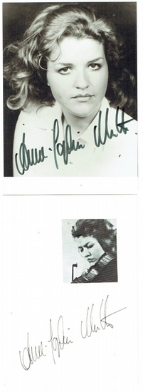 Portraitpostkarte mit eigenh. Unterschrift auf der Bildseite. ohne Ort , 1984. 150 : 100 mm. Brustbild von vorn. Dabei: Eigenh. Unterschrift auf Albumblatt und Begleitbrief ihres Sekretariats.