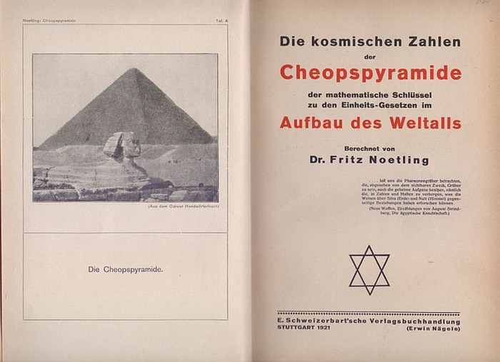Die kosmischen Zahlen der Cheopspyramide. Der mathematische Schlüssel zu den Einheits-Gesetzen im Aufbau des Weltalls. Stuttgart, E. Schweizerbart (Erwin Nägele), 1921. Gr.-8vo. Mit 3 Taf. (1 mehrf gef.) u. zahlr. Fig. im Text. Titel in Rot u. Schwarz. 181 S., 1 Bl. Schlichte Hlwd. d. Zt. m. hs. RSchild. Der Geologe Fritz Noetling (1857-1928) schrieb sein letztes Buch während seiner Internierung während des Ersten Weltkriegs in Australien. Mathematisch-esoterische Theorie in pseudowissenschaftlichem Gewande. Die Zahlen, die aus der Pyramide und der Steintruhe in der Königskammer gegriffen werden, erklären angeblich neben dem Planetensystem auch die Atomgewichte sowie das Klimakterium des Menschen und die Schwangerschaftsdauer bei Mensch und Tier. - Einband berieben, Vordergelenk zu 1/3 angeplatzt u. unsachgemäß repariert. Exlibris auf Innendeckel, Stempel auf Vorsatz u. Vortitel.