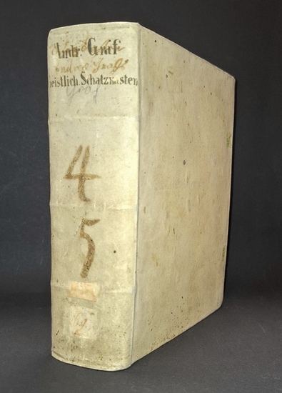Geistlicher Schatz-Kasten / In welchem allerhand sehr kostbahre Tugend-Schatz / und edel-grosser Reichthumb der Verdiensten unterschiedlicher Heiliger begriffen... Das ist: Ein recht ausführliche, allen Seel-Sorgern und Predigern leichteste, ordentliche Weiß und Manier... ANGEBUNDEN: Graff, J.A. Dreyfache Glory, Das ist: Drey offentliche Lob-Red von drey groß-berühmten Heiligen, S. Georgio. M. S. Floriano. M. S. Rocho. B. Augsburg, Schlüter, 1700. 11 Bl., 809 S., 27 Bl. (Index und Register), 72 S. Ganzpergament der Zeit. Ohne die letzte Seite 73. Ohne die Schließbänder. Papier in der Mitte etwas gebräunt. Ein paar wenige Wurmlöcher. Titelblatt mit 2 Zeilen Anmerkungen. - Gutes, authentisches Exemplar. K.