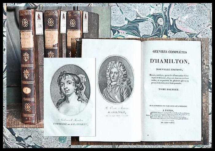 Oeuvres completes d'Hamilton. Nouvelle edition, revue, corrigee, pecedee d'une notice historique et litteraire, disposee dans un meilleur ordre, et augmentee de plusieurs pieces en prose et en vers. 3 volumes. Paris, Colnet, Mongie, Debray et Delaunai, 1805. 8°., together around 1450 pages, with 3 engraved portraits. Half-calf, spine gilt, marbled endpapers With three portraits of Hamilton (1646-1720), the comte de Grammont and Mademoiselle Hamilton, comtesse de Grammont. Contains I. Mémoires de Grammont - II. Fleur d'épine, Le bélier, Les quatre Facardins, L'enchanteur Faustus - III. Zeneyde, La volupté, Relations véritables de différens endroits d'Europe, Relation d'un voyage en Mauritanie, Lettres et Epitres, Poésies diverses, Chansons. Avec une notice historique et littéraire par L.-S. Auger. - Aus der Bibliothek Schönborn-Buchheim mit entsprechenden gestochenen Exlibris sowie den hübschen Etiketten mit dem roten Löwen auf den Vorderdeckeln. - Minor browning, mostly clean, rubbed, corners bumped, still nice, decorative bindings with a good provenance.