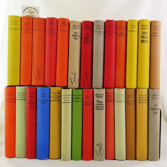 Roman-Konvolut / Sammlung / Reihe von 26 Bänden. Die letzte Spur. - Wo die Sonne sinkt.- Kämpfende Karawanen. - Arizonamädel. - Berlin, Knaur, o.Jahr. Originalleinenbände.21cm. SEHR gute REIHE. WEITER in dieser REIHE: Der verlorene Fluss. - Wüstengold. - Der Texasreiter. - Männer der Grenze. - Kampf um die Farm. - Tal des Todes. - Die Todeskarawane. - Der geheimnisvolle Reiter. - Der eiserne Weg. - Die Grenzlegion. - Nevada. - Der Löwe von Arizona. - Betty Zane. - Bis zum letzten Mann. - Vollblut. - Gesetz des Westens. -. Räubernest. - Das Erbe der Wildnis. - Der Mann aus dem Walde. - Westliche Sterne. - Die Unzertrennlichen.- Arizonamädel. Kämpfende Karawanen. - Männer aus Texas. Der Wanderer in der Wüste. Selten, vor allem in dieser sehr guten Erhaltung. (Wir bieten zahlreiche Titel aus diesem Sachgebiet auf unserer HP an - We offer a lot of books in this field ).