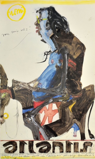 Von mir aus. 1984. [Signiertes Original-Plakat / signed original poster]. _. (Horst Janssen, geboren am 14. November 1929 in Wandsbek bei Hamburg, gestorben am 31. August 1995 in Hamburg. Zeichner, Grafiker, Autor, Plakatkünstler, Illustrator und Fotograf, einer der herausragendsten und produktivsten Zeichner und Grafiker des 20. Jahrhunderts). Original-Plakat (Farboffsetdruck) auf weißem Papier. Plakat für die Buchhandlung und Galerie Atlantis, Duisburg, anläßlich der Vorstellung des Fotobuches über Horst Janssen von Nomi Baumgartl am 11. November 1984. Von Horst Janssen innerhalb der Abbildung in Blei signiert. Werkverzeichnis Meyer-Schomann Nr. 147. Maße Blatt: 81 x 49 cm. Sehr gutes Exemplar.