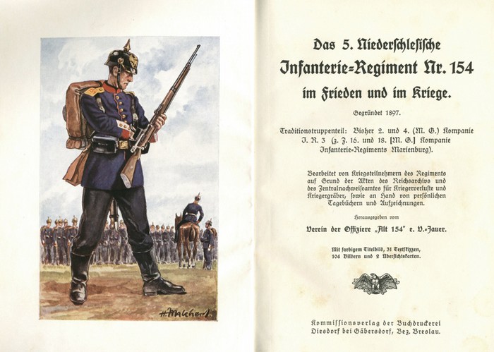Das 5. Niederschlesische Infanterie-Regiment Nr. 154 im Frieden und im Kriege. Gegründet 1897. Traditionstruppenteil: Bisher 2. und 4. (M.G.) Kompanie J.R.3 (z.Z. 16. und 18. [M.G.] Kompanie Infanterie-Regiment Marienburg). Bearbeitet von Kriegsteilnehmern des Regiments auf Grund der Akten des Reichsarchivs und des Zentralnachweisamtes für Kriegerverluste und Kriegergräber, sowie an Hand von persönlichen Tagebüchern und Aufzeichnungen. Herausgegeben vom Verein der Offiziere "Alt 154" e.V.-Jauer. Diesdorf bei Gäbersdorf, Kommissionsverlag der Buchdruckerei (1935). * Mit farbigem Titelbild, 31 Textskizzen, 104 Abbildungen auf Tafelseiten und 2 mehrfach gefalteten Übersichtskarten in Kartentasche am hinteren Buchdeckel. 515 Seiten. 22,5 x 15,5 cm. Blauer Original-Leinenband (gering fleckig und berieben) mit goldgeprägtem Rückentitel und Deckelvignette. *** Ausführliche schlesische Regimentsgeschichte. - Innengelenke minimal gelockert. Nur ganz vereinzelt minimal fleckig. - Gutes Exemplar.
