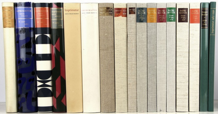 Imprimatur. Ein Jahrbuch für Bücherfreunde. Herausgegeben von Siegfried Buchenau und Georg Kurt Schauer (später von Konrad F. Bauer, Bertold Hack, Heinz Sarkowski, Hans Karl Stürz, Georg Ramseger, Horst Meyer, Eva Hanebutt-Benz und Stefan Soltek). Neue Folge, Band 1-15 und 2 Registerbände in zusammen 17 Bänden. Frankfurt/M., Gesellschaft der Bibliophilen 1957-1994. * Mit zahlreichen Tafeln und Textabbildungen. 24,5 x 19 cm. Original-Leinenbände (zwei Rückenschilder beschädigt), teils mit Original-Umschlägen. *** Die ersten 15 Bände der Neuen Folge; beiliegend die Registerbände für die Bände I-XII (1930-1955) der ersten Folge und die Bände I-XIV (1956/1957-1991) der Neuen Folge. - Von guter Gesamterhaltung.