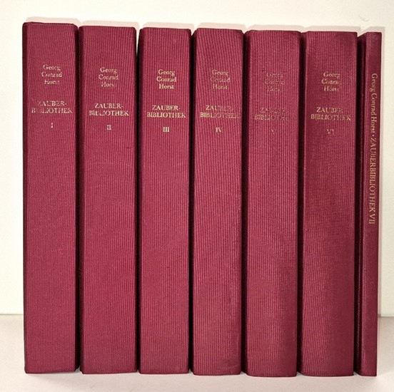 Zauber-Bibliothek oder von Zauberei, Theurgie und Mantik, Zauberern, Hexen und Hexenprocessen, Dämonen, Gespenstern und Geistererscheinungen. Mit einer Einführung von Herbert Kempf. 7 Bände (alles). Freiburg, Aurum (Edition Ambra), 1979. Je Band ca. 400 S., Bd. 7 Registerband 92 S. Roter Orig.-Seideneinband. *Bibliotheca Mystica et Occulta. - Nachdruck der Ausgabe Mainz 1821-1826. - Leichte Gebrauchsspuren, 2 Einbände etw. fleckig. Dennoch schönes Exemplar. L.