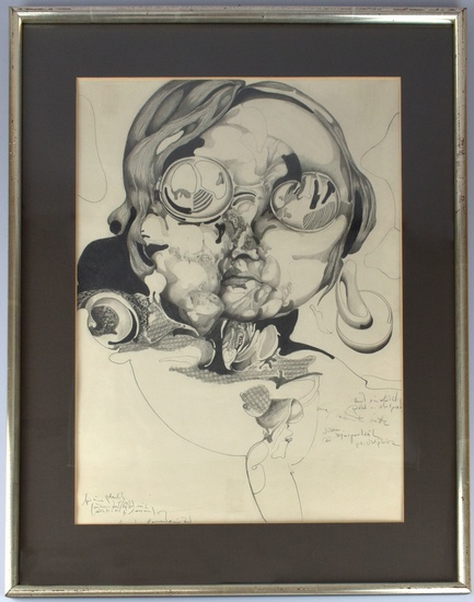 Skizze zu Vexierbild Peter O. Chotjewitz. [19]70. [Signierte Bleistiftzeichnung, gerahmt / signed pencil drawing, framed]. _. (Bert Gerresheim, geboren am 8. Oktober 1935 in Düsseldorf. Studium 1956 bis 1960 an der Düsseldorfer Kunstakademie bei Otto Pankok, zusammen mit Günther Uecker und Germán Becerra. Bildhauer, Grafiker und Pädagoge). Original-Bleistiftzeichnung auf Papier. Unterhalb der Abbildung von Bert Geresheim in Blei beschriftet: "Skizze zu Vexierbild P. O. Chotjewitz, für eine Plastik, unterer Teil wird auskragen lassen", signiert und datiert (70). Hinter Glas/Passepartout gerahmt im einfachen, vergoldeten Holzrahmen. Nicht ausgerahmt. Provenienz: Aus der Sammlung von Wilhelm Blasberg, von diesem 1997 in der Galerie Blau erworben. Maße Rahmen: 63,0 x 48,0 cm. Maße Blatt/Abbildung: 48,5 x 34,5 cm. Holzrahmen mit leichten Kratzern. Grafik mit schwachen Knicken, insgesamt sehr guter Zustand. Original pencil drawing on paper. Inscribed in lead below the image by Bert Geresheim: "Sketch for a puzzle picture by P. O. Chotjewitz, for a sculpture, lower part to be projected," signed and dated (70). Framed behind glass/mounted in a simple, gilded wooden frame. Not removed from the frame. Provenance: From the collection of Wilhelm Blasberg, acquired from him in 1997 at Galerie Blau. Frame dimensions: 63.0 x 48.0 cm. Sheet/image dimensions: 48.5 x 34.5 cm. Wooden frame with slight scratches. Graphic with slight creases; overall very good condition.