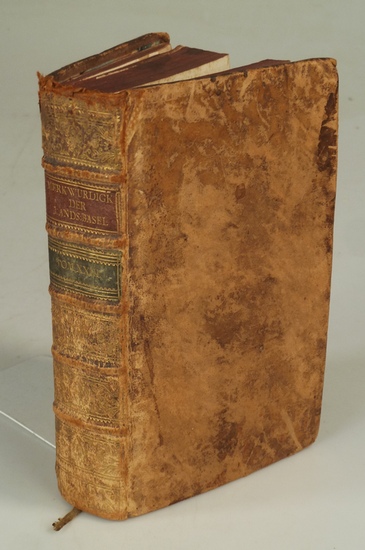 VERSUCH EINER BESCHREIBUNG HISTORISCHER UND NATÜRLICHER MERKWÜRDIGKEITEN DER LANDSCHAFT BASEL XXIII. STÜCK. Mit sehr vielen Abbildungen im Text, mit Frontispiz und 26 Tafeln. Basel, Thurneisen, 1763. S. 2665- 3077 (14). Lederband der Zeit. Einband berieben, Kapital mit Läsuren. Ca. 50 im hinteren Viertel an der oberen Ecke stärker braunfleckig (nur Rand). Sonst nur leicht stockfleckig.