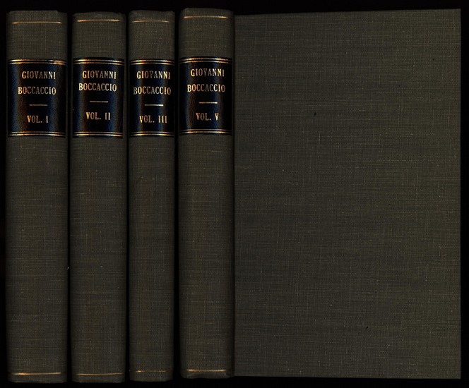 Il decamerone Di M. Giovanni Boccaccio. Bände 1-3 und 5. 4 Bände (von 5). Londra (Paris), 1757. 8°. 20,5 x 13,5 cm. [1] Blatt, XI, 292 Seiten; [1] Blatt, 271 Seiten; [1] Blatt, 195 Seiten; [1] Blatt, 247 Seiten. Moderne Leinenbände mit goldgeprägten Titeln auf Lederrückenschildern und marmoriertem Schnitt. Erste Ausgabe. Italienischsprachige Ausgabe. Cohen/Ricci 158. Sander 182. Fürstenberg S. 78. Brunet I, 1003. Mit insgesamt 4 gestochenen Frontispizen, einem gestochenen Porträt und 88 weiteren Kupfertafeln und zahlreichen figürlichen Vignetten. Die Kupferstiche nach Gravelot, Boucher, Cochin und Eisen durch Aliamet, Baquoy, Flipart, Legrand, Lemire, Lempereur, F. Lempereur, Leveau, Moitte, Ouvrier, Pasquier, Pitre-Martenasie, Saint-Aubin, Sornique et Tardieu. Breitrandiges Exemplar. Band 4 fehlend. Seiten leicht gebräunt und vereinzelt minimal stockfleckig, ansonsten sehr gutes Exemplar. Modern cloth bindings with gilt titles on leather spine labels and marbled edges. First edition. Italian-language edition. Cohen/Ricci 158. Sander 182. Fürstenberg p. 78. Brunet I, 1003. With a total of four engraved frontispieces, one engraved portrait, and 88 further copper-engraved plates as well as numerous figurative vignettes. The engravings after Gravelot, Boucher, Cochin, and Eisen were executed by Aliamet, Baquoy, Flipart, Legrand, Lemire, Lempereur, F. Lempereur, Leveau, Moitte, Ouvrier, Pasquier, Pitre-Martenasie, Saint-Aubin, Sornique, and Tardieu. Wide-margined copy. Volume 4 lacking. Pages slightly darkened and occasionally with minimal foxing, otherwise fine copy.
