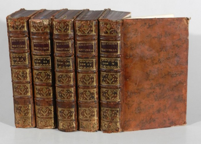 Dictionnaire raisonné universel d'histoire naturelle; contenant l'histoire des animaux, des végétaux et des minéraux, et celle de Corps célestes des Météores, & des autres principaux Phénomenes de la Nature. Avec l'Histoire et la description des drogues simples tirees des trois regnes; & le détail de leurs usages dans la médecine, dans l'économie domestique & champêtre, & dans les arts & métiers. Abeille bis Zoo cplt. en 5 volumes. Paris: Didot, Musier, De Hansy Panckoucke 1764-1765. Cuir brun lissé de l'époque sur cinq véritables nerfs avec deux écussons sur le dos et richement doré, ainsi que des tranches rouges sur tous les côtés (frotté et éraflé, en partie un peu éraflé, les dos en partie avec de petits manques [cf. photo], les reliures des volumes 2 et 3 avec quelques traces de vers, à chaque fois un nom d'époque sur la page de titre, sinon bons et propres exemplaires). 17 x 10,5 cm. Première édition de ce dictionnaire important et novateur.