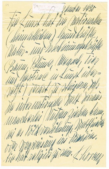 Eigenh. Gedichtmanuskript mit U. u eigenh. Brief mit Unterschrift. o. O. [Malente-Gremsmühlen], Dezember 1930. Folio. 2 pp. ?Die Kunst hat die nationalen (heimatlichen) Grundkräfte Natur- und Erschauungskräfte (Baum, Blume, Mensch, Tier und Gestirne in Kunst übersetzt) derart zu steigern, daß die internationale Welt daraus mancherlei Nutzen ziehen kann [?]? - Ab 1913 schrieb er Gedichte, 1914 erschienen seine ersten Gedichte in Buchform. Während des Ersten Weltkrieges war er Armierungssoldat, er dichtete aber weiter und bekam Kontakt mit dem Kunsthistoriker und Schriftsteller Wilhelm Niemeyer von der Kunstgewerbeschule Hamburg. Nach dem Krieg 1919 wurde er Mitglied der Künstlergruppe Hamburger Sezession. Im gleichen Jahr wurde er mit Rosa Schapire Herausgeber der Zeitschrift ?Die Rote Erde ? Monatsschrift für Kunst und Kultur?. Als Mitarbeiter der ersten Ausgabe sind genannt: Kurt Bock, Georg Britting, Alfred Brust, Albert Ehrenstein, Paul W. Eisold, Lyonel Feininger, Rudolf Friedmann, Erna Gerlach, Werner Gothein, O. M. Graf Walter Gramatte, Adolf De Haer, Sylvia von Harden, W.G. Hartmann, Erich Henkel, Kurt Haynicke, Hans Jauquemar, Edlef Köppen, Karl Kriete, Albert Rudolf Leinert, Carl Mense, Rudolf Mense, Emil Maetzel, Paulfried Martens, Conrad Felixmüller, Otto Müller, Wilhelm Niemeyer, Walter Petrey, Max Pechstein, Walter Rheiner, Willi Reindel, René Schickele, Karl Schmidt-Rottluff, Anton Schnack, Hermann Schütte, Martin Schwemer, Wilhelm Tegtmeier, Alfred Wolfenstein, Friedrich Wolf, Otto Zarek.1921 war er auch Verantwortlicher für Veröffentlichungen des Adolf-Harms-Verlags und gab dort ?Die Drucke der Tafelrunde? heraus, in dem auch Georg Britting veröffentlichte. 1922 gründete er mit Paulfried Mertens den ?Gemeinschaftsverlags Hamburger Künstler? und druckte expressionistische Gedichte und Prosa. 1923 machte die Wirtschaftskrise dem allen ein Ende.Er zog nach Malente-Gremsmühlen und gründete dort 1924 die ?Turmpresse?. Ein Ein-Mann-Unternehmen, das hochwertige Bücher in kleinen Auflagen herstellte.Darin gab er eine Vielzahl von expressionistischen Handdrucken heraus, von denen er selten mehr als 25 Exemplare pro Druck fertigte. Karl Lorenz bezeichnete seine Drucke als ?Farbwerke?.Die Bild- und Texttafeln der ?Turmpresse? sind nach dem Vorbild mittelalterlicher Blockbücher großformatig in Holz geschnitten. Beim Kolorieren verwendete Lorenz zwei Verfahren: Entweder er druckte wie Edvard Munch zunächst die Farbpartien und anschließend darüber den Schwarzdruck, oder er kolorierte die Schwarzdrucke zum Schluss mit der Hand. Lorenz? Ziel waren einfache, volkstümliche Drucke mit intensiv leuchtenden Farben. Die Bildtafeln haben keinen direkten Bezug zum Text; ihre Motive sind eine Ergänzung der Schriften.Bei den mehr als 150 Texten, die Lorenz für seine Buchwerke auswählte, handelte es sich um Auszüge aus den Werken großer Schriftsteller wie Goethe, Nietzsche und Heine, aber auch um seine eigene Dichtung. Im Prospekt zu seiner Werkausgabe von 1922 heißt es: ?Der Dichter Karl Lorenz ist in unserer Zeit einer der stärksten, eigenartigsten und tiefsten Sprachschöpfer auf deutschem Boden. Seine Sprache ist bewegt und reich, bunt und glühend.? Durch die ?Turmpresse? überlebte der expressionistische Gedanke das eigentliche Ende der Bewegung um mehrere Jahre.1933 wurde Karl Lorenz vorübergehend in ?Schutzhaft? genommen. Die Nationalsozialisten griffen seine Zeitschrift an, und er musste Gutachten über ihren künstlerischen Wert erbringen. Nach dem Ende des Zweiten Weltkriegs kehrte Lorenz aus Malente-Gremsmühlen nach Hamburg zurück, wo er im Februar 1961 verstarb.