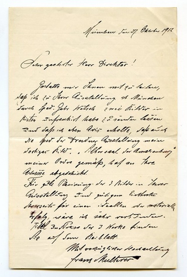 Eigenh. Brief mit U. München, 27. Oktober 1912. 1? SS. auf Doppelblatt. Gr.-8vo. An den namentlich nicht genannten Kunsthistoriker und Direktor des Kunstmuseums Essen Ernst Gosebruch (1872?1953): ?Gestatte mir Ihnen mitzuteilen, daß ich zu Ihrer Ausstellung ab München durch Sped. Gebr. Wetsch zwei Bilder in Kisten unfrankiert habe zusenden lassen und daß ich eben Avis erhalte, daß auch die Sped. der Dresdner Ausstellung mein dortiges Bild ?Silbersaal der Amalienburg? meiner Ordre gemäß hat an Ihre Adresse abgeschickt [...]?. ? Franz Multerer studierte an der Académie Julian in Paris, war als Genre- und Interieurmaler tätig und schuf bevorzugt Rokoko-Interieurs und Jagdszenen. Vgl. Thieme-Becker XXV, 262. ? Bl. 2 mit der Anführung dreier Bilder und ihrer Preise.