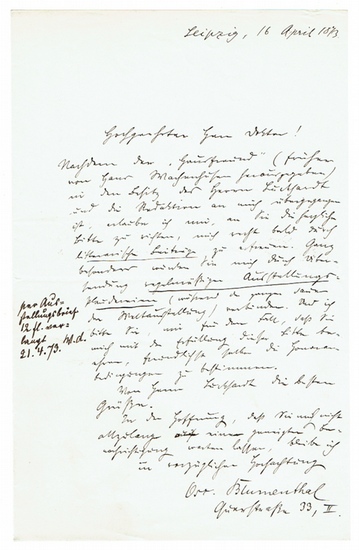 Eigenhändiger Brief mit Unterschrift. Leipzig, 16. IV. 1873. 8vo. 1 p. ?Nachdem der ,Hausfreund? (früher von Hans Machenhusen herausgegeben) in den Besitz des Herrn Luckhardt und die Redaktion an mich übergegangen ist, erlaube ich mir, an Sie die fachliche Bitte zu richten, mich recht bald durch litterarische Beiträge zu erfreuen. Ganz besonders würden Sie mich durch Übersendung regelmäßiger Ausstellungsplaudereien (währen der ganzen Dauer der Weltausstellung) verbinden. Und ich bitte Sie, mir für den Fall, daß Sie mich mit der Erfüllung dieser Bitte beehren, freundlichst selber die Honorarbedingungen zu bestimmen. [?]?.