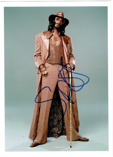 Portraitphotographie mit eigenh. Unterschrift. ohne Ort und Datum. 130 : 180 mm. Brustbild in ganzer Figur. - Zu seiner Anfangszeit nannte er sich Snoop Doggy Dogg. 2012 gab er bekannt, von nun an Reggae anstatt Rap zu machen und sich Snoop Lion zu nennen. 2013 veröffentlichte er als Snoopzilla zusammen mit Dâm-Funk unter dem Bandnamen 7 Days of Funk ein Funk-Album mit dem gleichnamigen Titel 7 Days of Funk. 2015 veröffentlichte er ? wieder unter dem Namen Snoop Dogg ? ein Album mit dem Titel Bush. 2018 vollführte er mit der Veröffentlichung eines Gospel-Albums (Bible of Love) erneut einen radikalen Stilwechsel. Mit einem Vermögen von 150 Millionen US-Dollar gilt Snoop Dogg als einer der reichsten Rapper.