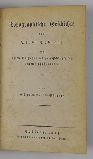 Topographische Geschichte der Stadt Coblenz von ihrem Entstehen bis zum Schlusse des 18ten Jahrhunderts. Coblenz, Pauli, 1815. 16,5 x 10,5 cm. 252 S., 1 Bl. Pappband der Zeit mit gold. RTitel, co. (etwas angestaubt u. fleckig). Allgemeine Deutsche Biographie 10 (1879), S. 177 [Online-Version].- Wilhelm Arnold Günther (1763-1843), hatte in seiner Funktion als Stadtarchivar von Koblenz die Möglichkeit zum ausführlichen Quellenstudium von "tausenden von Urkunden", die als Grundlage für seine Veröffentlichung dienten.- Exemplar aus dem Archiv des Karl Baedeker Verlags in Leipzig mit entsprechendem Stempel.- Die ersten u. letzten Seiten gering braunfleckig.- Selten.