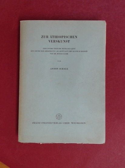 Zur Äthiopischen Verskunst. Eine Studie über die Metra des Qene. Auf grund der Abhandlung "Al-Qene Laun min As-Si`r Al-Habasi" von Dr. Murad Kamil. Wiesbaden: Steiner, 1961. XVI, 313 Seiten Original-Broschur. Der Buchrücken ist etwas stärker ausgeblichen. Der Einband ist leicht fleckig, sonst handelt es sich um ein gutes Exemplar mit nur leichten Gebrauchsspuren. Textsauber und aus einem Nichtraucherhaushalt. Dieses Exemplar stammt aus der Bibliothek von Walter W. Müller, Professor für Semitistik an der Philipps-Universität Marburg.