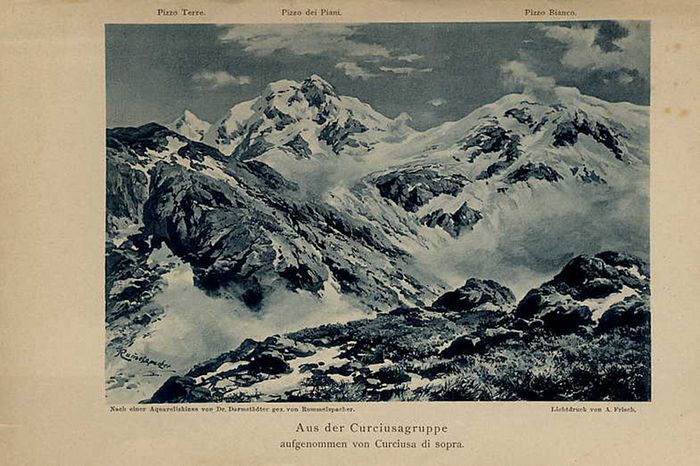 Aus der Curciusagruppe (Pizzo Terre, Pizzo die Piani, Pizzo Bianco). Lichtdruck nach einer Aquarellskizze - Bildbeilage aus der Zeitschrift des Deutschen und Österreichischen Alpenvereins. Wien Innsbruck München, 1894. S. 1 22 x 14 cm Einzelblatt leicht braunfleckig.