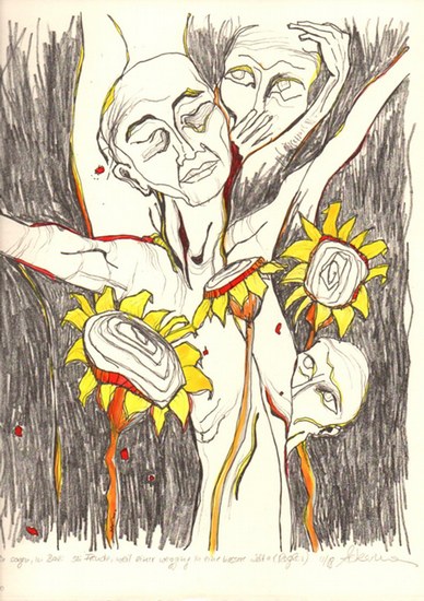Originalgraphik zum Thema "Hommage à Gustav Regler 1898 - 1963". `Sie sagen, zu Bali sei Freude, weil einer wegging in eine bessere Welt (Regler)`. Handschriftliche Titelbezeichnung.
