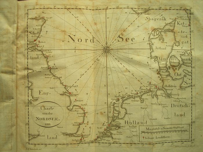 Erstes Ausgabe dieses wichtigen Navigationslehrbuches, das von dem bekannten Hamburger Wasserbaudirektor Reinhard Woltman (1757-1837), wohl unter Mitarbeit des Lehrers an der Navigationsschule Johann Michael Müller (gest. 1819), herausgegeben worden ist. Ab der 4. Auflage von 1844 wurde es von dem bekannten Astronomen u. Direktor der Hamburger Navigationsschule u. Sternwarte K. L. Chr. Rümker (1788-1862) bearbeitet. - Das erste Buch behandelt die mathematischen Grundlagen, das zweite Buch die praktische Schifffahrtskunde, also Schiffsrechnung nach Maß u. Berechnung der Kurse, sowie deren Korrektur durch astronomische Beobachtungen. Der zweite Teil mit den unabdingbaren Tabellen. - Die Kupfer zeigen Sternbilder, Instrumente, nautische Berechnungen, außerdem mit einer Weltkarte u. einer Karte der Nordsee. - Vorrede datiert "im October 1818". - Vornamen u. Sterbejahr von Müller nach den Hamburger Adressbüchern von 1818-1820. Provenienz: Vorsatz mit zeitgenöss. Eintrag "J. L. Bonartz", Spiegel mit späteren Einträgen Baak (Baake). Schröder 4507, 13. - ADB 44, S. 199. - Hamb. Biographie 2, S. 451f. (alle zu Woltman). - Crone Library 783. - Houzeau/Lancaster 10792. - Beschabt, Ecken bestoßen. Vorsatz mit kleiner montierter teilkolor. Tuschzeichnung eines Dreimasters. Leicht gebräunt, etwas stock- u. tintenfleckig. 1 Tabelle mit längerem Einriß, 1 mit kleinem Ausriß (kein Textverlust).