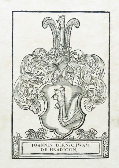 Böhmen, vor 1569. circa 21,6 x 14,5 cm., 1 Blatt. verso weiss Leiningen-W. 74, I (mit Abbildung); Warnecke 379. Hier das seltene, grösste von vier Formaten dieses Exlibris. Der aus Brüx (Most) in Böhmen stammende Kaufmann und Humanist Dernschwam de Hradiczin (1494-1568) ist heute vor allem durch das Tagebuch seiner Orientreise bekannt. Von seiner bedeutenden Büchersammlung wurden 651 Bände im Jahr 1568 von der kaiserlichen Bibliothek in Wien übernommen. - "Dernschwam hat in Leipzig, Wien und Rom studiert. Er gehörte zu dem Wiener Humanistenkreis im Gefolge Balbins. Als Prinzenerzieher in Budapest und Preßburg kam er mit Hans und Georg Thurzo und Jakob Fugger in Verbindung und trat vermutlich schon 1518 in Thurzos Kupferbergbau in Neusohl (Slowakei, Banska Bystrica) ein. Seit seinem erfolgreichen Eingreifen bei dem Budapester Aufstand gegen die Fugger-Faktorei 1525 übernahm er die vom König an die Fugger verpachteten Kupfergruben als leitender Faktor in Neusohl bis zur Auflösung des Vertrages 1546. Er bereiste wiederholt Ungarn und zeichnete, neben seiner handelspolitischen Tätigkeit, auch römische Inschriften auf. 1549 schied er aus den Fuggerschen Diensten, blieb aber in der Slowakei (Oberungarn) und von da aus mit den deutschen Humanisten bis an den Rhein in Briefwechsel und Büchertausch. Noch im Alter von 59 Jahren schloß er sich aus freiem Willen der kaiserlichen Gesandtschaft zum türkischen Sultan an und hat über diese mehr als 2jährige Reise ein Tagebuch handschriftlich hinterlassen, dessen Bedeutung wegen der darin enthaltenen wirtschafts- und kulturpolitischen Beobachtungen zu seiner Zeit durch die erste, 1555 darin aufgezeichnete, Abschrift des Monumentum Ancyranum des Kaisers Augustus gesteigert wurde." (NDB III, 609f.).