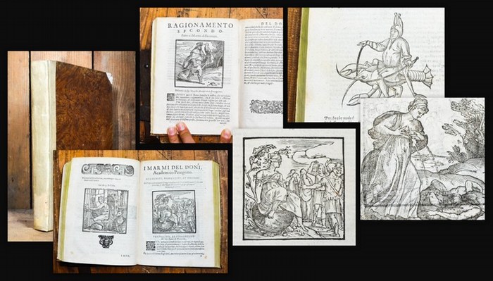 Venezia, Bertoni, 1609. 4°, circa 20,5 x 15 cm., 8 ff., 66, 40, 81 (recte 79) numbered leaves (without the last blank leaf), with 72 woodcuts by Marcolini. 19th cent. half-vellum See Brunet II, 813, Gamba 1368 and. Graesse II, 424. Second edition of one of the major works by Doni with slight changes to the first printing in 1552 and now for the first time with a very useful index. The work contains a stange mixture of gossip, anecdotes, political traetises, essays on gastronomy, wine and customs at the table, superstition, the printing of books etc. Grendler (Critics of the Italian World) explains the title as: "Things overheard on the marble steps" while sitting on the stairs of Santa Reparata in Florence. The dialogue about the art of printing at the beginning of the second book is actualy by Domenichi who critized Done very sharply when publishing it in a book of his own in 1562.