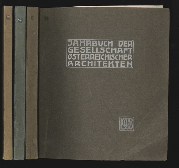 Beinahe vollständige Reihe des nur zwischen 1907 bis 1910 erschienenen Jahrbuches der Österreichischen Architekten. Nach dem Rechenschaftsberichten des jeweiligen Vereinsjahres folgen Texte und Projektberichte u. a. von Josef Hoffmann, Otto Wagner, Otto Schönthal, Robert Örley, Karl Dorfmeister und Oskar Strnad. Einbandentwurf des dritten Bandes von Emil Hoppe.