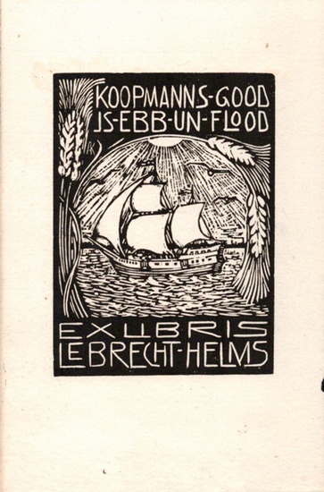 Der Kaufmann Lebrecht Helms, Inhaber eines "Speditions- u. Lagerungsgeschäfts in Harburg-Wilhelmsburg, war der Sohn des Senators, Kaufmanns u. Gründers des Museumsvereins f. Harburg, August Helms (1847-1920)] = Holzschnitt (Handdruck) von Albert König (1881-1944), eine unter vollen Segeln fahrende, von Getreideähren eingerahmte Kogge darstellend, Motto: "Koopmanns Good is Ebb un Flood". In der Platte monogrammiert.